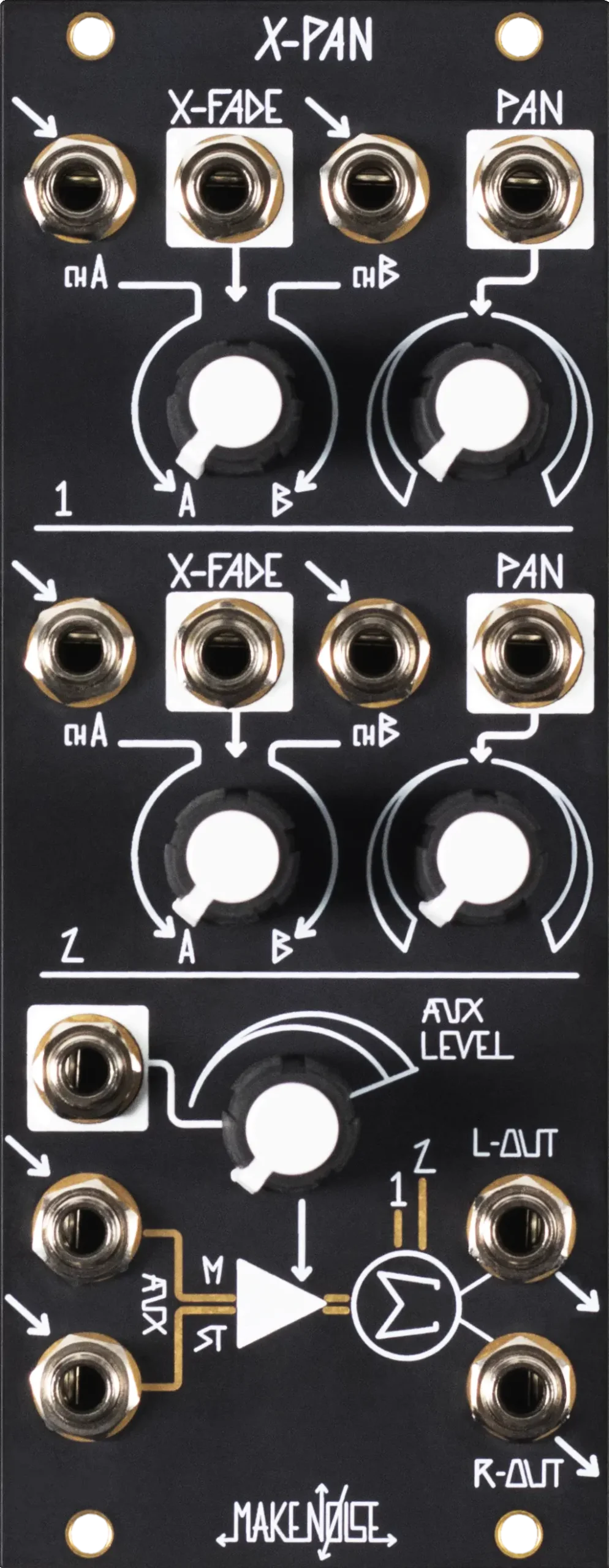 X-PAN is highly responsive to control signals allowing for exploration of the fluctuating stereo sidebands possible with Audio Rate Crossfading and Panning. X-PAN is Direct coupled for use as a CV Processing and Routing toolbox.