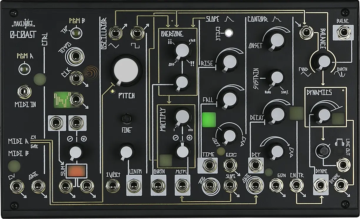 While the 0-COAST utilizes classic modular synthesis techniques, we designed it to operate with or without the use of patch cables. The necessary connections have been made from circuit to circuit so it operates as an expressive, musical MonoSynth. Using only the MIDI controller of your choice you could apply new timbres to your existing musical forms!